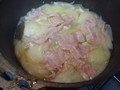 濃いたまねぎのスープ この前に買っておいたたまねぎが2個余っていたので、タマネギをほとんど無水でスープにしてみました。2時間弱煮込んで、こんな感じになります。 底にちょっとだけ水を張って、残りはタマネギの水分だけです。あめ色になったこのぐらいがいいところかな。ローリエとベーコンの塩分だけの味付けで十分です。ほとんどとろとろのスープですが、たまねぎの甘さが存分に味わえます。