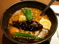 モモ入り激辛 いつもの通り原宿帰りはこのお店。今日はMOMOという餃子が入っているスープカレー。今日は辛さをあげて3段階目(一応激辛、でもさらに上に数十段階がある)にしてみました。たしかに汗はかきますけど....なんかあんまりピリピリ辛くないんですよね。じわーっと効いてくる辛さっていうのは結構好きですね。ここのカレーは辛さよりなにより、野菜のうまさ。ニンジンの甘さといったら、なんでこんなにでかくて甘いんでしょ。ナスのやわらかさとか、レンコンの歯触りとか、とにかく野菜が旨いお店です。