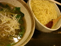 今日は「塩つけ麺」今まで食べたことが無いメニューです。数年毎にいろいろ新しいメニューが開発されるこのお店。これもなかなか研究されています。右側の赤いものは辛味調味料。前半は普通にそのまま食べた後、後半スープにこの辛味を入れて別の味にして食べるというもの。塩つけ麺は塩辛くなりがちな所を具の春菊などでやわらげているあたりもさすがです。