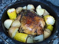 スタッフドチキン。1kgの小さい鳥なんですが、10インチだとこのぐらいが他の野菜を入れるスペースもあっていいのかな。焦げた松葉みたいなものはローズマリーです。