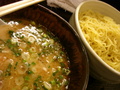 豚つけ麺 実家の近くの人気店。前は昼の後に数時間の夜に向けた仕込みがあり、再度18時から営業だったのですが最近は連続稼働になった模様。おおかげで18時前には行列になっていたお店が結構簡単に入れました。 この店は、醤油、とんこつ、とんこつ醤油の3種類が基本で、ラーメンとつけ麺があり、これはとんこつ醤油のつけめん。これといって特別な所はないのですが、平均的にレベルの高いお店です。場所が結構便利な所にあるわけじゃないので、このままこのぐらいのお客さんの数で続けていって欲しいです。
