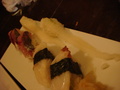 今日はたっぷりのウニの寿司が有名なこのお店。ところがその肝心のウニがきれているとのことで、普通のお寿司をいろいろ。これはエンガワ、タコ、アジなんですが、こうなってしまうとエンガワはぐるぐ巻きにして食べないといけません。にぎり寿司じゃなくて、エンガワ巻き寿司状態。