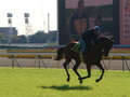 アルティストロワイヤル、アメリカの6歳馬。調教と言うよりかなり軽めでのんびり走っています。日が低くて天気がよいので、周囲が明るすぎで補正しないと馬が真っ黒になってしまいます。