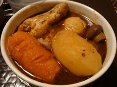 初自作スープカレー 保温調理鍋ならば、普通のカレーよりスープカレーがうまくできます。ニンジンもジャガイモもかたまりのままゴロゴロ煮ても見事に味がしみこんでいきます。 初回ながら、なかなかうまくできました。