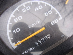実家の原付、とうとうメーターが一周回る瞬間が来ました。地球を1/4周走ったことになるんですね。まとめて1,000kmとか走らず、毎回10km以内を積み重ねてここまで来ました。