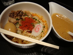 地元の新店舗。いわゆる汁無しラーメンが一押しらしいです。これは辛いつけ麺。スープをちょっと入れればかき混ぜやすくなるようです。限定200食のため何度か来て閉店だったのですが、今日は空いていて並ばずに入れました。