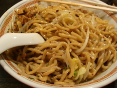 まぜそば 最近流行のまぜそば。いわゆる汁なし、です。見た目は結構アレですが、これでなかなか美味しい。結構ジャンキーな味なんですけどね。 こんなの食べちゃったから、ちゃんと運動してカロリーを消費しとかないと。特に中山開催はあんまり走らないので運動不足気味ですから(笑)