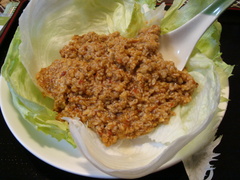 肉そぼろのレタス巻き 日曜日に行った昔なじみの中華屋さんの定番メニュー。自作してみました。タケノコじゃなくてエリンギで作ったところがちょっと違いますが、うまくできました。 ちょっと肉そぼろが多かったかな。味を濃くして量を減らせばほぼお店と同じになります。