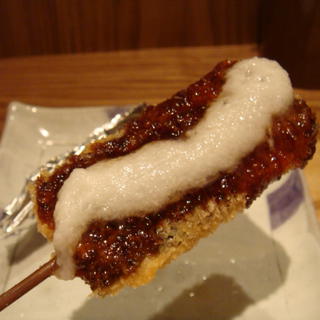 うなトロ 今日は帰り道がてら串揚げ屋さんへ。それぞれ必ず一工夫のある串揚げをたっぷり。これは「うなトロ」うなぎの串揚げにタレをつけてトロロ。何もつけづにいただきます。油っぽくなくさっぱり食べられるので、何本でもいけちゃいそうです。
