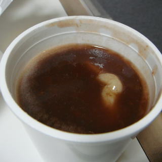 餅0.5の謎 持ち主さんの爪が右下に写っちゃってます(笑) 中山競馬場のおしるこ。お餅の数は1.5枚。なぜか半分のお餅がついてます。でも、最終レース近くなると、お餅をおまけしてくれたりするんですよね。ただし、G1レースだと数が出ちゃうので、どんどん薄くなっちゃいます。 実は同じお店で磯辺焼を頼んで、醤油も海苔もつけないでもらってこれに入れるという方法もあるんですよね。おしるこではなくて豚汁に入れてお雑煮、という手もあります。結構上級技(笑)