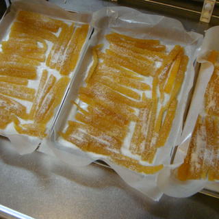 晩白柚ピール 恒例の晩白柚のピール作りです。一個でこれだけできちゃうんですから、やっぱり大きいですよね。もともと癖があまり無いので、ちょっと苦めに作ってもいい感じです。 天気が悪いので、なかなか固まらないのが辛いですが、できあがりが楽しみ。