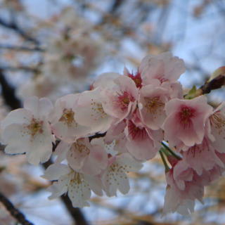 競馬場の河津桜が終わると、競馬場近くのこの桜が満開になります。丁度今が散り始めのいい時期です。この桜は最初紅くて、花が満開になるにつれて白くなるんですね。
