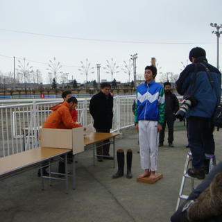 世界最高の騎手 北海道内のニュースにはあちこちでていましたが、ばんえいでは世界最高の騎手をギネスに登録しようとしています。 そう、身長。ばんえい競馬の新人ジョッキー林君ですが、身長が190cm以上とのことなので、世界最「高」の騎手を狙えそうです。ギネスのルールとしては、一日3回、毎回起きて、寝ての2パターンで計るそうなです。これはお昼の計測の様子。この後、折りたたみの机の上に寝て計測していました。寝ると194cmもあるんです(寝た方が身長が伸びるらしい) さて、ギネスに載るかどうか楽しみですね。