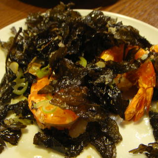 烏龍茶葉と海老の炒め物 地元の一番の中華料理のお店。今日も2店目の新店舗にやってきました。マスターもこっちでずっと頑張っているようです。今日も例のごとく空心菜の炒め物が出てきたり美味しい料理のオンパレードなのですが、必ず新しいメニューが出てくるのもこのお店の特徴。 今日はこれ、烏龍茶の葉と海老の炒め物。烏龍茶の葉を揚げたものと海老なのですが、そんなにお茶の香りがキツイわけじゃなくてちょっと香る程度。それがまたいい具合なんです。