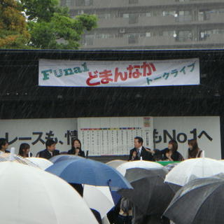 というか、船橋の応援団のイベントです。天気は相変わらずですが、結構みんな熱心に聞いてます。この中ではアベコーさんは割と専門家じゃないグループの扱いなのね(笑)