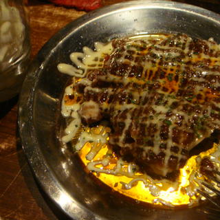 鶏のネギソースのステーキ お好み焼きのようですが、鶏の葱ソースのステーキ。実家の近くの駅の飲み屋さんのメニュー。この葱ソースが絶品で、横にある生キャベツをこれで食べてもたまりません。 このお店、ワインから日本酒、焼酎までお酒が揃っていて、それに合わせたメニューもあるけど、お店はスポーツバーのような形態、という不思議なところ。客層が若いけど、食べ物はかなり美味しいものばかり。なんとなくもったいないよなぁ。