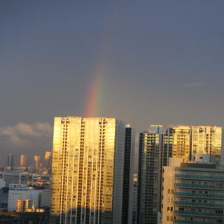 向かいのビルから虹が出ていました。本当は半円見えるんですけど、このカメラじゃ広角にしても入らないんですよね。