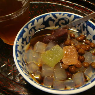 自宅近辺の梅園の近くの寒天で有名なお店のみつ豆。6人分で一セットなんですが、数日食べ続けても飽きないのでたまーに買ってきちゃいます。