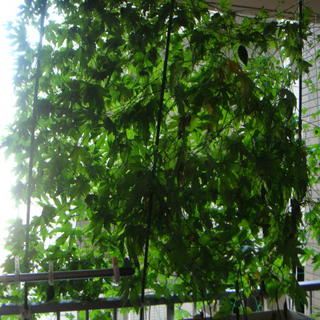グリーンカーテンというより グリーンカーテンというより、グリーンウォール状態になっているゴーヤ。 ここへきてやたら実がついてきました。とはいえ、長くならないのはなんなんでしょうかね? この画像の右下の方にもひとつ実が見えますね。 来年は本数減らしてもっと根を張るようにしたほうがいいのかな。