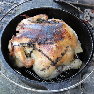BBQといえば定番のダッチオーブンでの鳥の丸焼き。手間隙かからず簡単ですが、出来上がりが豪華になるというお得料理です。