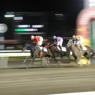 流し撮り 今日は当然大井です。たとえメインぎりぎり到着でも来る時間があるなら来ちゃうのが本当の競馬好きってもんです。 といいつつ、実は結構カメラの実験が主目的だったりします。これは流し撮り。CMOSの特徴的な写り方ですね。とはいえ、秒速10枚で撮影できるんですから、そんじょそこらの一眼レフより高速撮影できちゃいます。