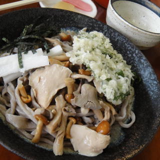 きのこそば ここは日高あたりではわりと有名なお蕎麦やさん。冷たいおそばできのこそばにしてみました。こちらの特徴はこの太さのランダムなそば。きのこなんだかそばなんだかよくわからない状態になっていますが....うまいんですよ。そばの味をたっぷり楽しめるおそばです。