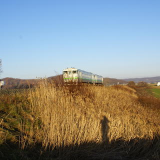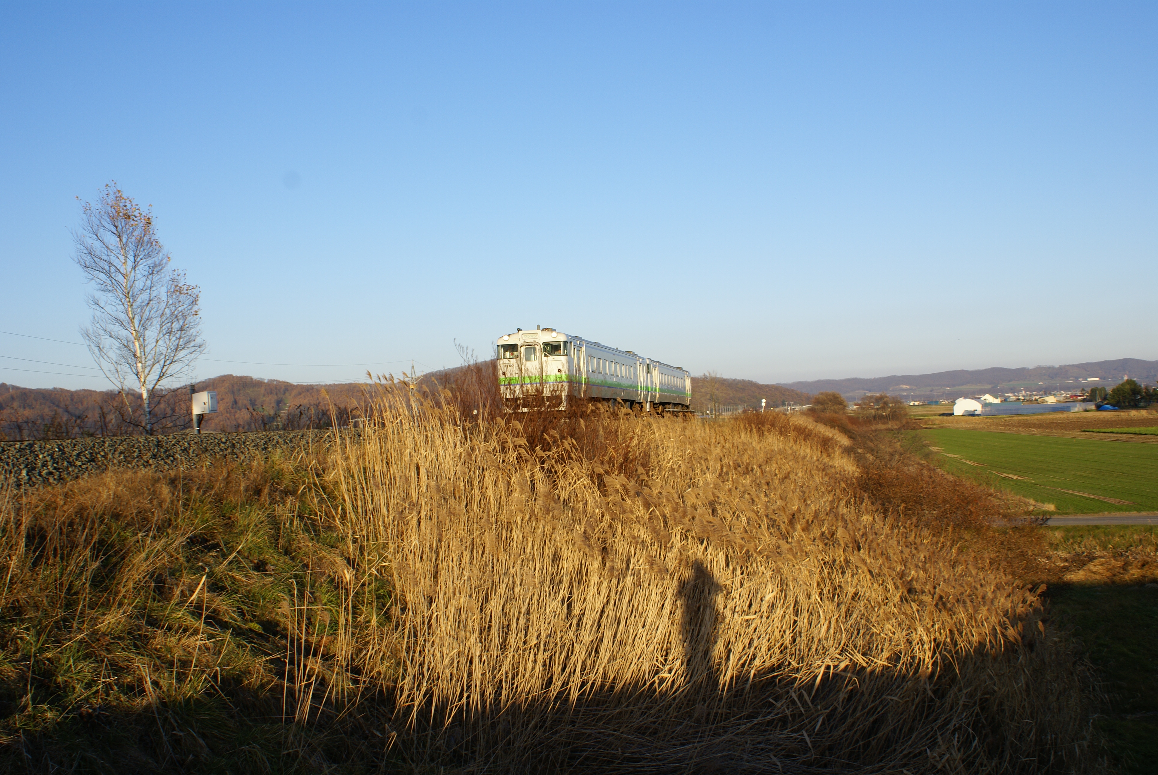 利別-幕別間 運よく数分後に列車が通るということで、一眼構えて準備。 目の前の列車って当たり前だけど早いんですね....橋の上の撮影はうまくいかなかったのでこれが数少ないまともな一枚。一人旅って感じがよく出ています。