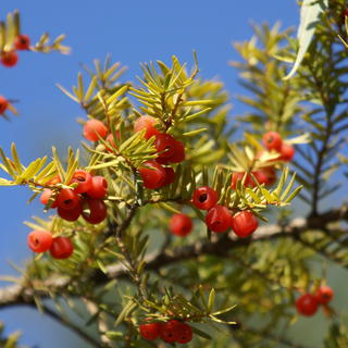 開門ちょっと前についたので、門の周りを一眼レフ持ってうろうろ。イチイがきれいな赤い実をつけていました。実は甘いんですが、種は毒があるんですよね。