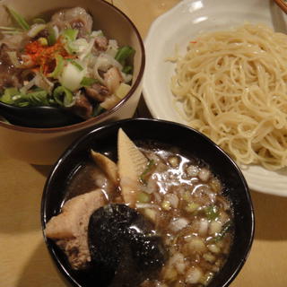 今日は限定 今日は限定、夏の懐かしいメニューの鯖系。たけのこのシャキシャキと豚が入った出汁系のスープ。魚粉系ではありません。 左上は、塩ネギ牛すじ飯。これもたまらんです。ここの牛すじはうまいんですよね。牛すじが美味いと言うと「そりゃうちの牛筋は和牛だからねぇ」とのことで。まいりました。