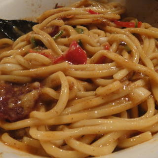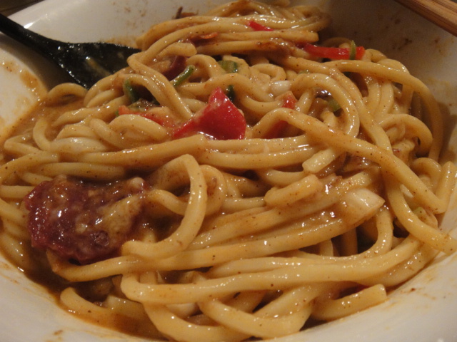 ぐりぐり混ぜて混ぜて、上のチーズが麺の熱で溶け始めたあたりが食べごろです。