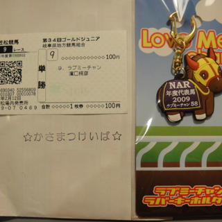 ラブミーチャングッズ ラブミーチャンのグッズです。このキーホルダーの後ろのコメントがなかなか...ですが敢えて書きません。面白いのが入っていた袋で、チラシを折った手作りの袋にハンコが押してあります。こういう手作り感がいかにも笠松っぽくていいですよね。 こういうのをいただくと、遠征熱が出てくるんですよね。今年は北海道以外にも遠征したいもんだなぁ。