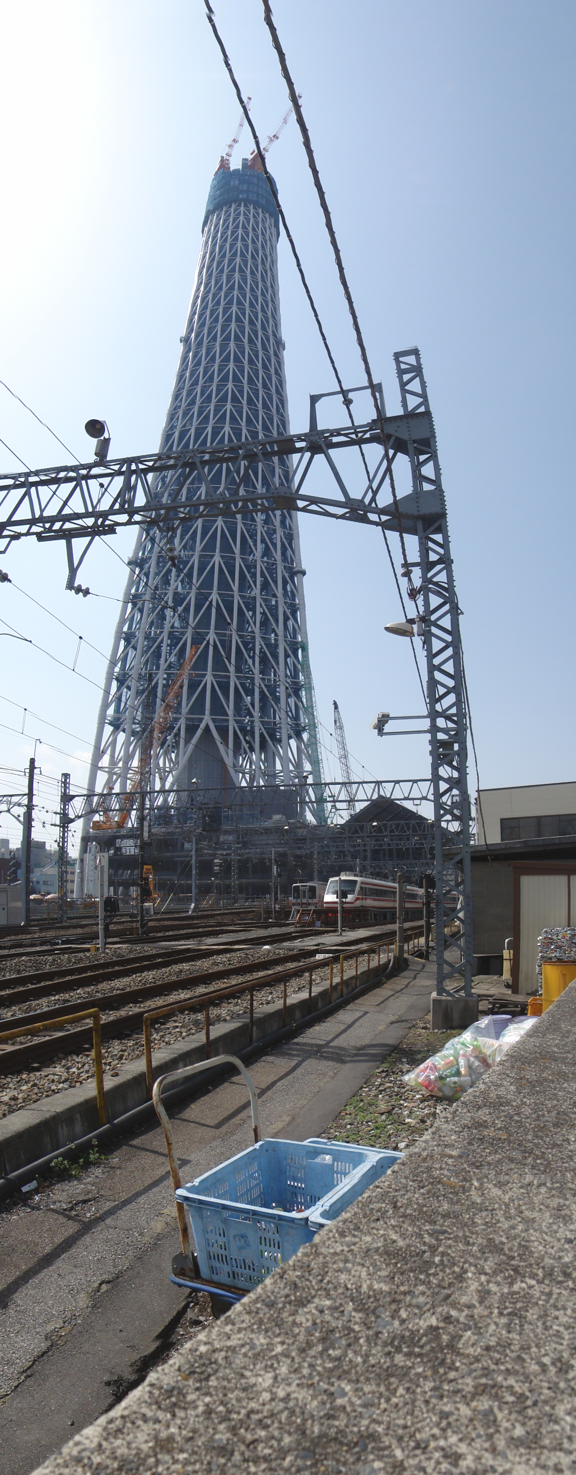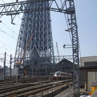 近くの車両基地から撮影した、鉄分高い人向けのスカイツリーの写真です。