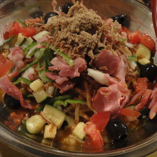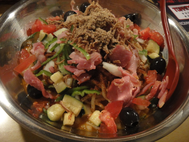 BBZ 今週のピザそばはビービーズィー (BBZ)ベーコン&ブラックオリーブ&ズッキーニ。この3つの食材がそれぞれ個性のある食感と味なので、いつのピザそばとはちょっと違った雰囲気に。今日も美味しくいただきました。