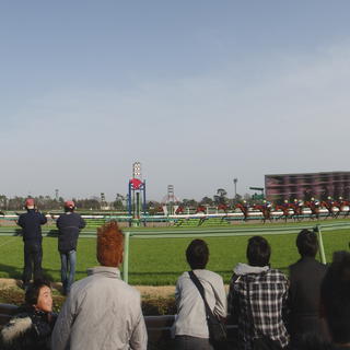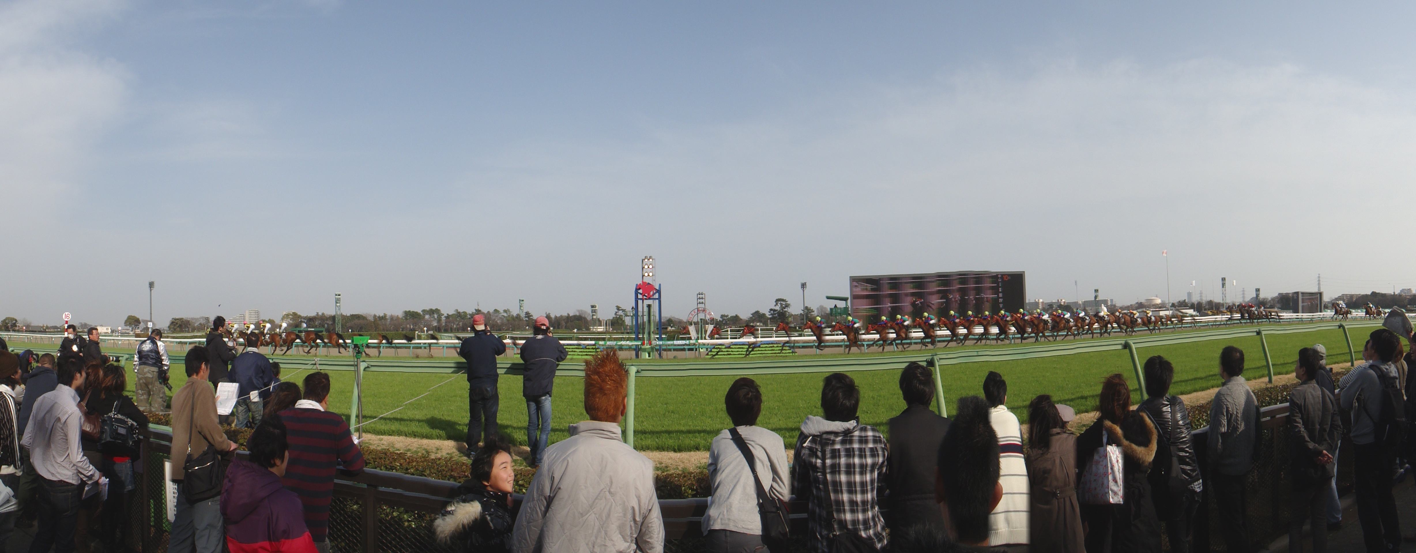 ゴールで馬が消える? パノラマ撮影のしくみを知っているとこういう写真も撮れちゃいます。馬の動きに合わせて撮影するとこうなるのですが....ちょっとゴール前でずれちゃったのでちょうどゴールには馬が写っていません。不思議な写真になりました。