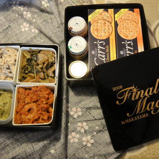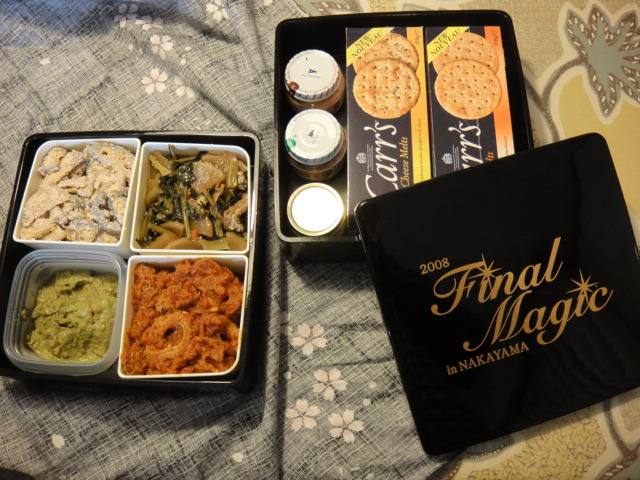 今年のお花見お重 今年のお花見のお重は、クラッカーとディップが上の重、下の重はレンコンのたらこ炒め、大根と大根の葉とあぶらげの煮浸し、アボガドディップ、トリッパのトマト煮。 お酒が桜のスパークリングと出羽桜。さてこれからお花見です。