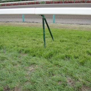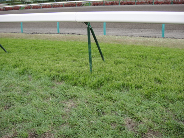 開催終わりなので、恒例の馬場解放。馬が走ると芝は左側のようになります。右側は馬が入れない領域。芝が倒れるというより、馬の走りで芝がこれだけ削れるっていうのがすごいですよね。