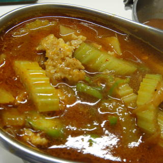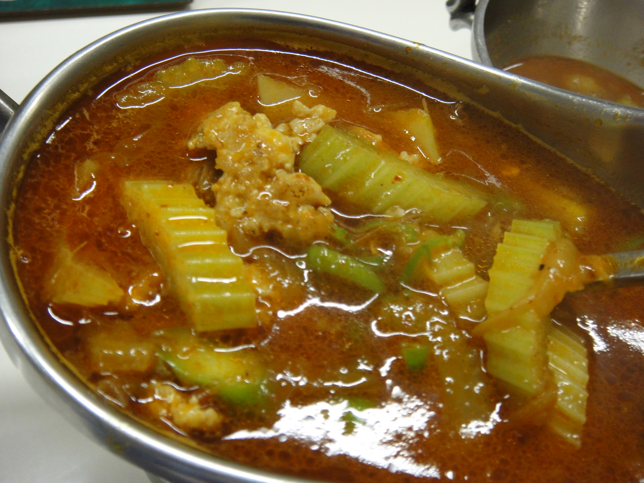 春の夜かれーは具の種類が多いのと、それが小さいので食べ方に工夫ができます。ひき肉、小柱、セロリ、アスパラガス、ししとう、この5つの具をまずはそれぞれ別々に食べながらすーぷを味わいます。具そのものの味とすーぷの組み合わせを楽しむわけです。その次に、具を2種類とすーぷの組み合わせを楽しみます。ひき肉とアスパラとか、小柱とセロリとか。ちなみに具は5種類あるので10通りの食べ方があります。そして、次は3つの具です。ししとうとアスパラと小柱、とかいう具合です。これも10通りになります。さて、次は4種類にチャレンジ、と行きたいところですが、このあたりにいくまでにだいたいかれーを食べきっちゃうんですよね(笑)