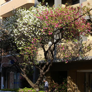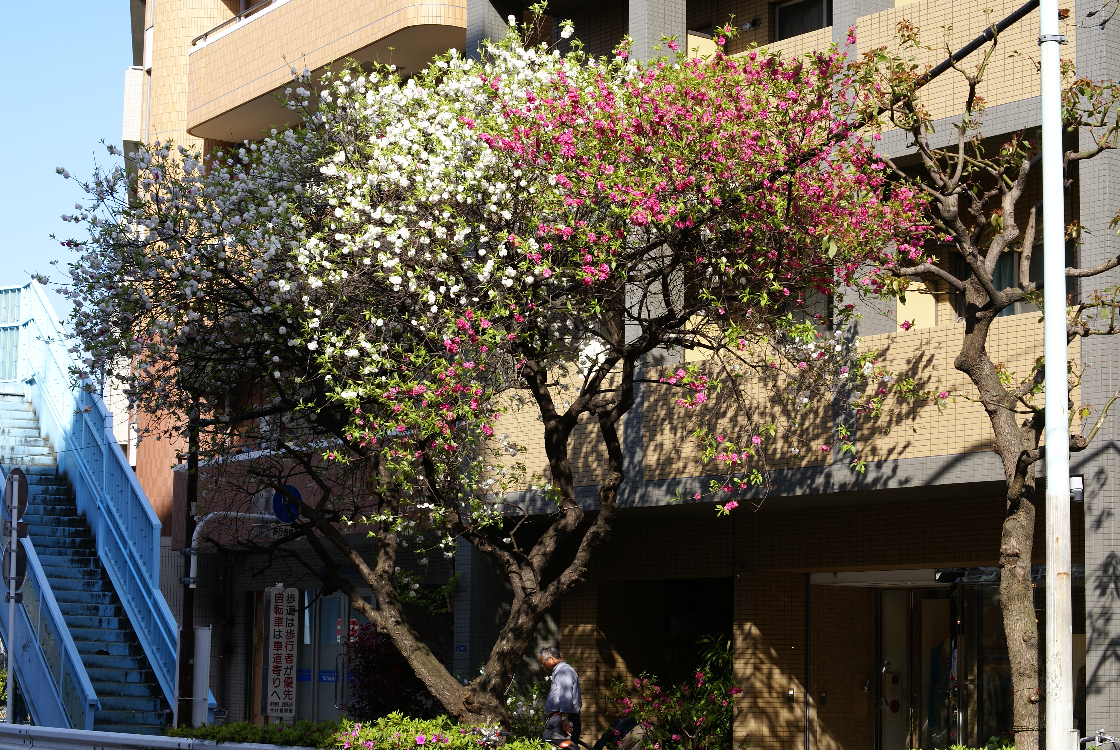 自宅近くの「源平桃」今が満開を過ぎて散り始め。紅白の花びらがはらはら落ちてきています。