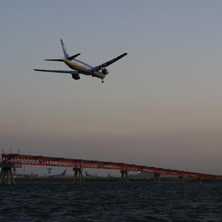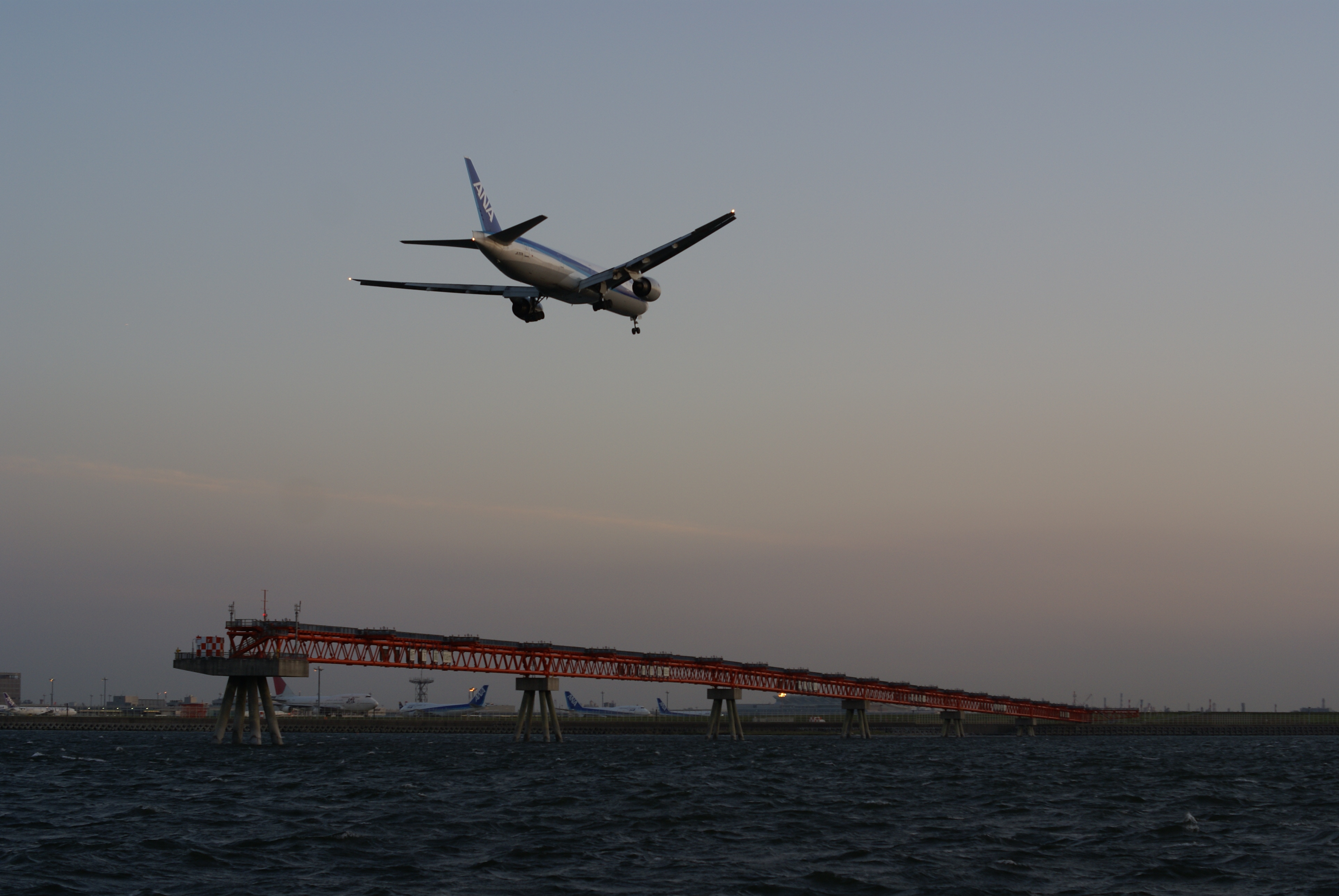 今日は天気もいいので久しぶりにこの場所で夕陽と飛行機をαで撮影。風がやたら強いので今日はこちらの滑走路の着陸を撮影することに。