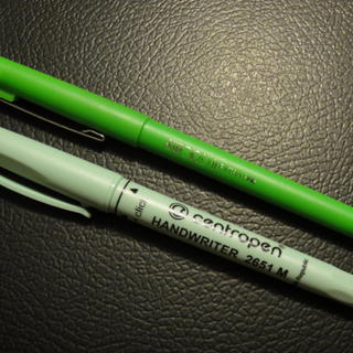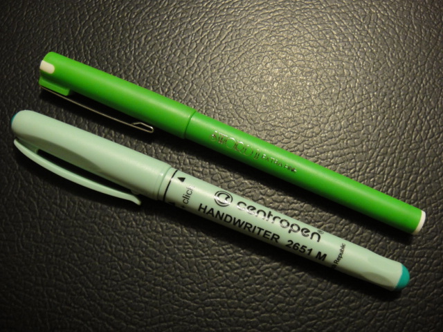 ここ数年探してファイバーチップペンという名前にたどり着き、そこからは一気に調査が進みました。そこで手に入れたのがこのペンになります。上のペンが今ある数少ない在庫のうちの1本の現役緑ペン。下のペンは今回発見した、centropenの HANDWRITER 2651の緑のペンになります。ちなみにcentropenはチェコの老舗文房具メーカーです。つまり輸入品。一本180円ぐらいで従来の約2倍の価格になりますが、なかなかいいかもしれません。これを今週末実験的に使ってみようと思っています。