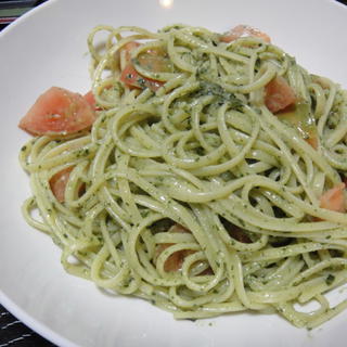 バジルとトマトのパスタ 自宅で育てていたバジル。かなり冷凍した葉がたまってきたので松の実とオリーブオイルとニンニクと塩でバジルペーストにしてみました。これをそれはパスタにしたもの。 売ってるものと比べてかなりバジルの香りが強くてさわやか。
