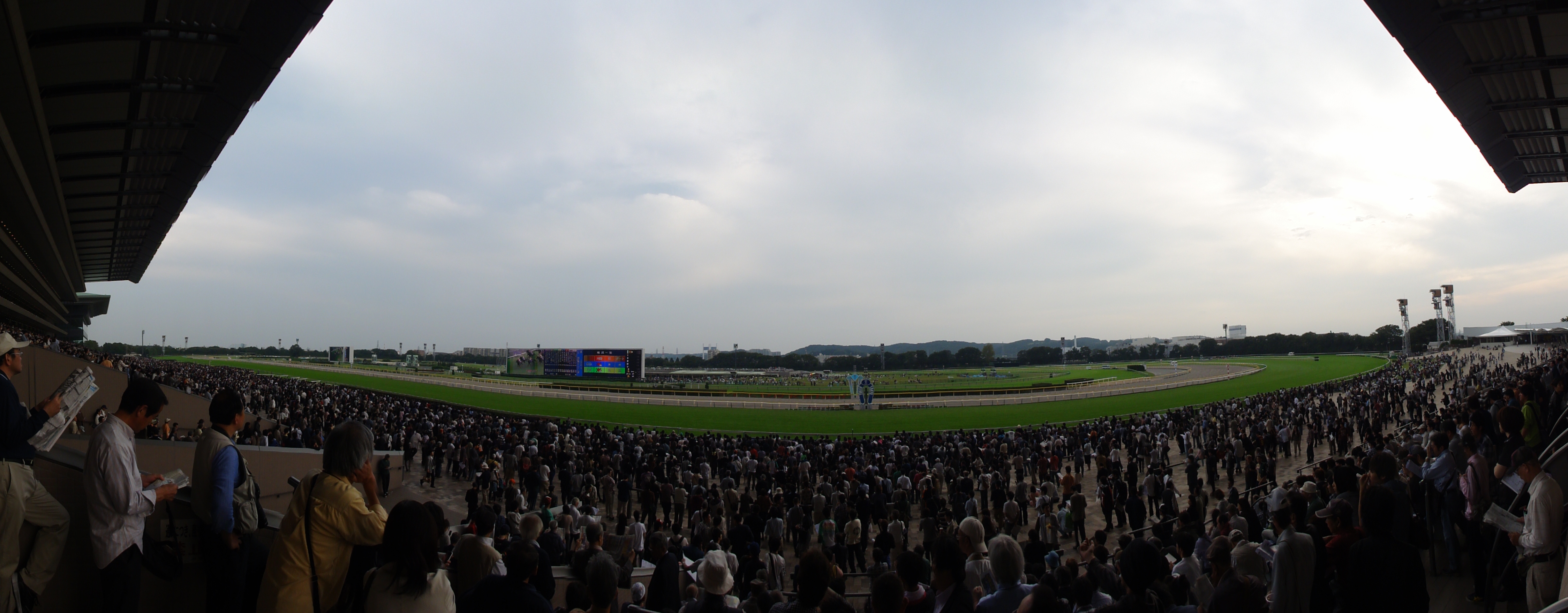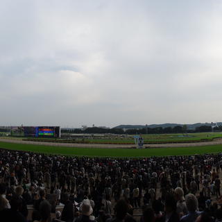 不思議な傾向 まるで土曜日のようなメイン時間のゴール板前の人の少なさ。でも不思議なのが左側に結構たくさん人がいるんですよね。やっぱりメインが京都のG1なのでターフビジョンの前に人が集まったんですかね、結構不思議な状況です。