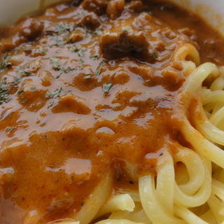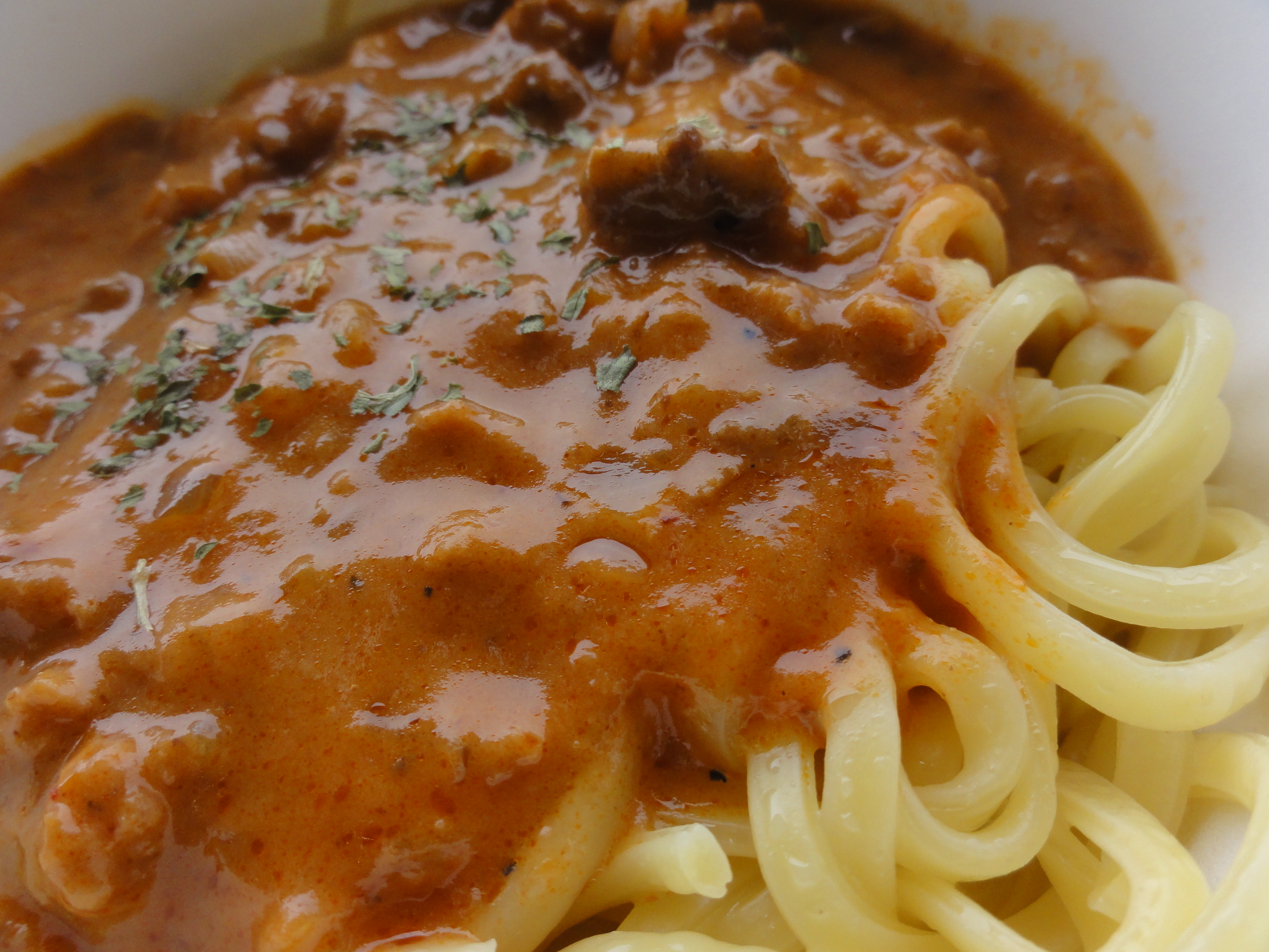 最近流行の接写 最近食べ物は接写で撮るのが流行だそうな。確かに美味しそうには見えちゃうんですよね。 今日のお昼はパスタ。ここのパスタがリングイネだっていうのがよくわかります。もちもち感があって美味しいんですよね。