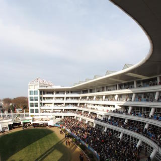 なかなか珍しいアングルの一枚。パドックを下から上まで一枚に。