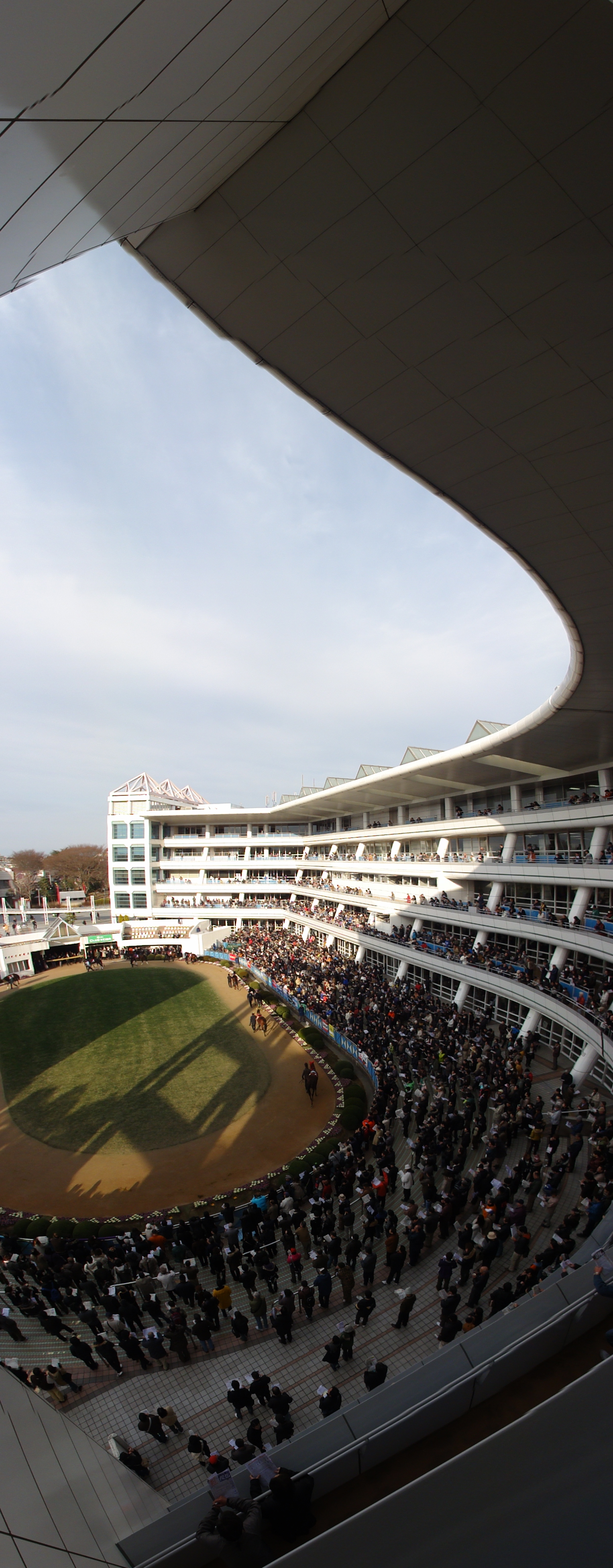 なかなか珍しいアングルの一枚。パドックを下から上まで一枚に。