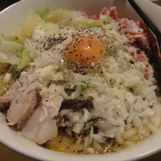 カルボナーラまぜそば 最近やっと行けるようになった近所のお店。 「これ混ぜ」というメニューですが、背脂を使ったカルボナーラっぽいまぜそばです。 これも定番になるといいのになぁ。完成度の高いまぜそばです。