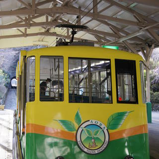 日本一 土曜日の続き。こちらのケーブルカーは日本一なんです。何が日本一か。 急勾配だそうです。確かに上から見ると転げ落ちたら下まで止まらないな感じの斜面。 上の勾配に合わせて車両をつくったせいで、下のなだらかな所ではなんとなく傾いた地面の車両になってしまいます。 左上に先のトンネルをみるとその角度がなんとなくわかります。