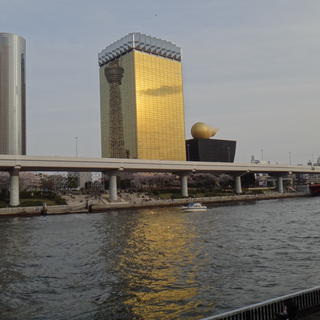 日曜日の花見のベストショット。ビルにスカイツリーが映りこむ有名なポイントからの撮影。