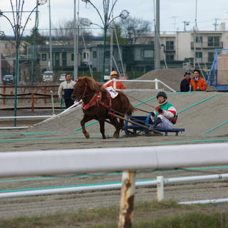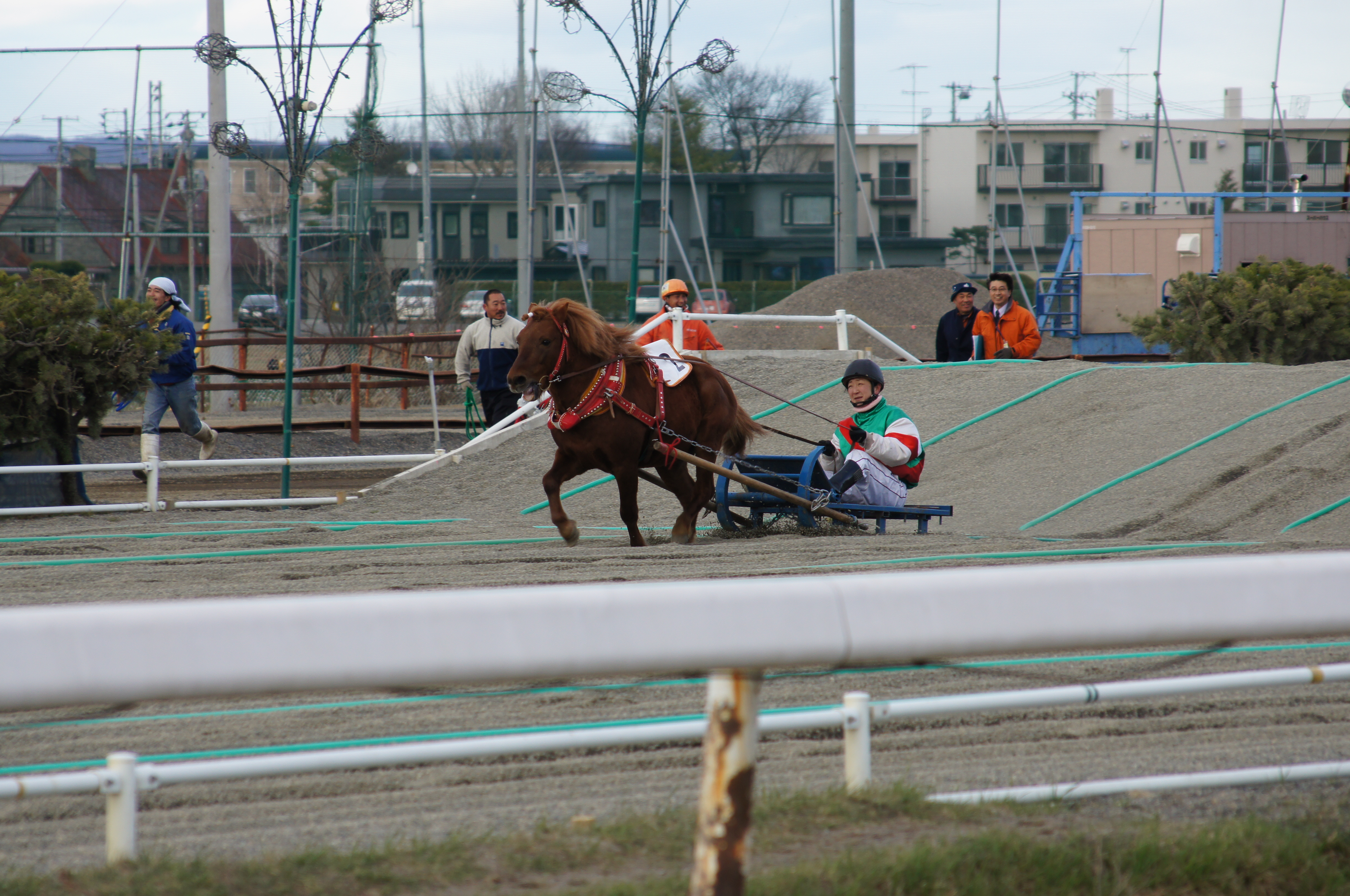 ポニーばんば 開幕週のイベントの一つ、ポニーばんば。調教師の奥さんや女性騎手が乗って競います。 これ、別の競技みたいで面白いです。障害ではなく本当にソリが山を登っている感じで結構楽しい。思わず後ろで見ている人達もみんな笑顔です。