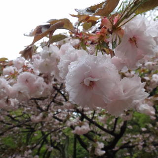 この時期は八重桜が満開、今日は大荒れの天気ですがけなげに咲いています。